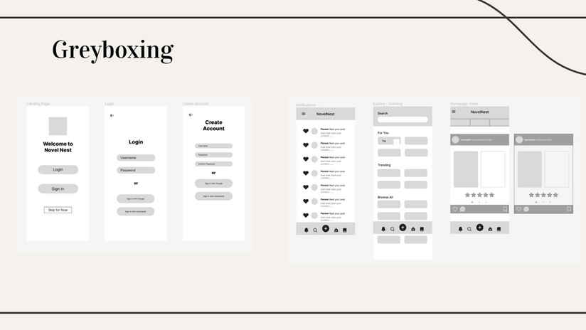 When designing the flow of the app the team prioritized solving the problems presented by Goodreads. Inspiration was taken from social platforms such as Instagram for image sharing, Twitter for text sharing, and Spotify for list creation and organization. User testing began during Mid-Fidelity, in which the post creation feature was changed to allow for additional post types. The chat feature was also added during this phase after it was determined it was wanted according to user feedback.